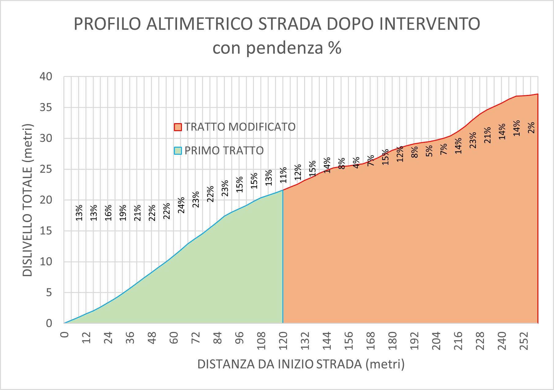 Sezione A-A del versante franato. PRIMA della frana (BLU) e DOPO la frana (ROSSO).Frana principale, parte alta – Prima dell’intervento – dislivello circa 200cm per abbassamento del piano stradaleFrana principale, parte alta – Dopo il ripristinoScarico acque meteoriche: quasi completamente nel Rio; in piccola parte nel campo a valleLunghezza tratto franato circa 90-100 m (abbassemanto del piano stradale di circa 180-200 cm)ampiezza frana circa 35mStrada dissestata, parte a valle